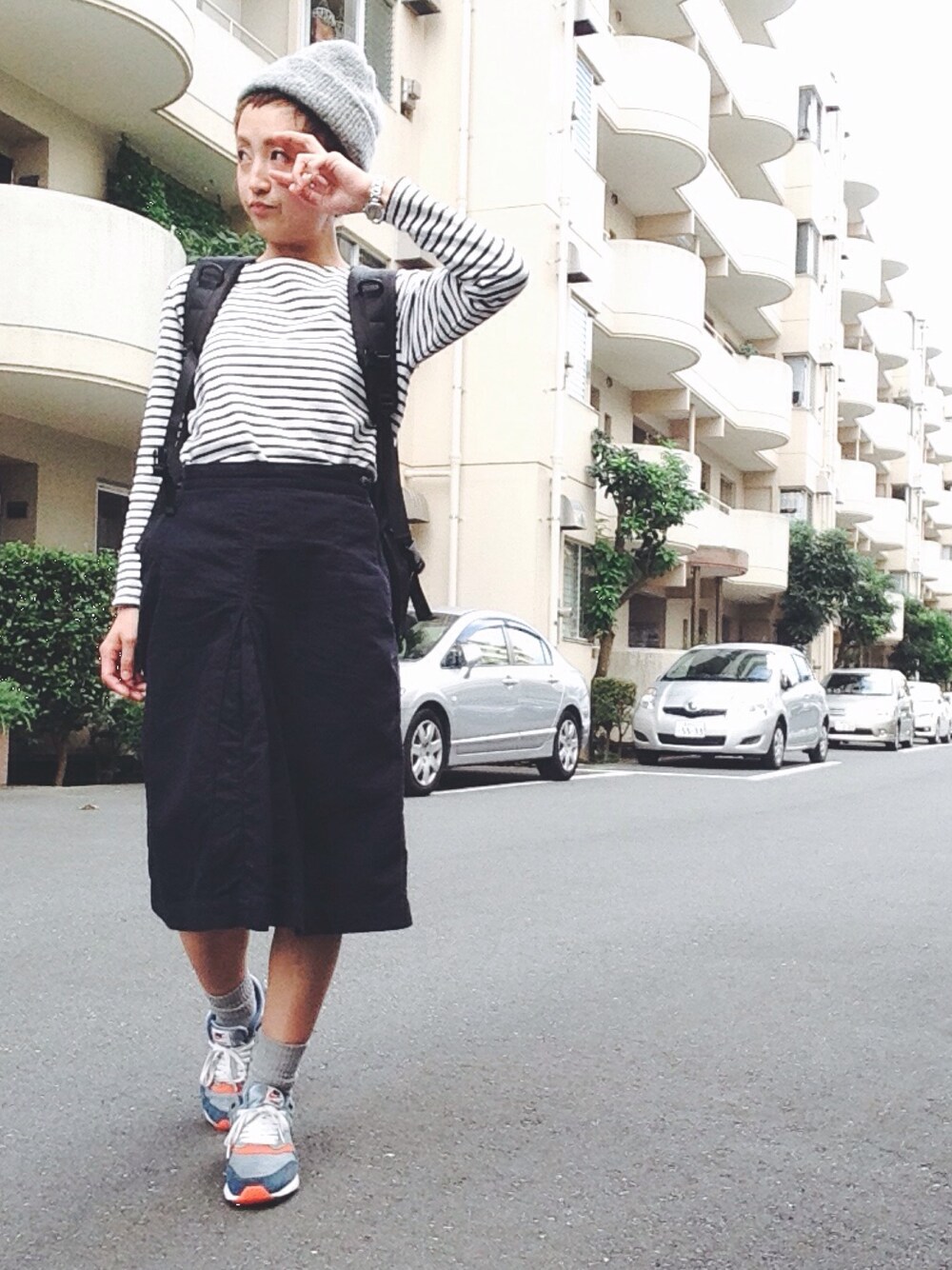 大好きな高橋愛ちゃんに乗っかって笑 モノトーンなシンプルコーデ レトロなランシューが映える(^ ^)♡ あーーー 眠い…(。-_-。)
