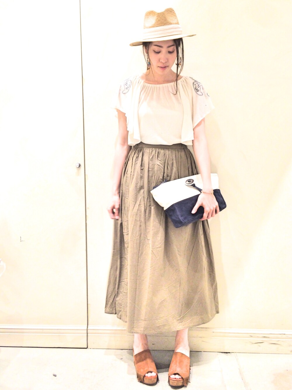 肩に刺繍の入ったフリル袖のカットソー♬オフショルにもなります♬ マキシスカートとフリンジサンダル、コンチョクラッチでネイティブ風(*≧艸≦)w