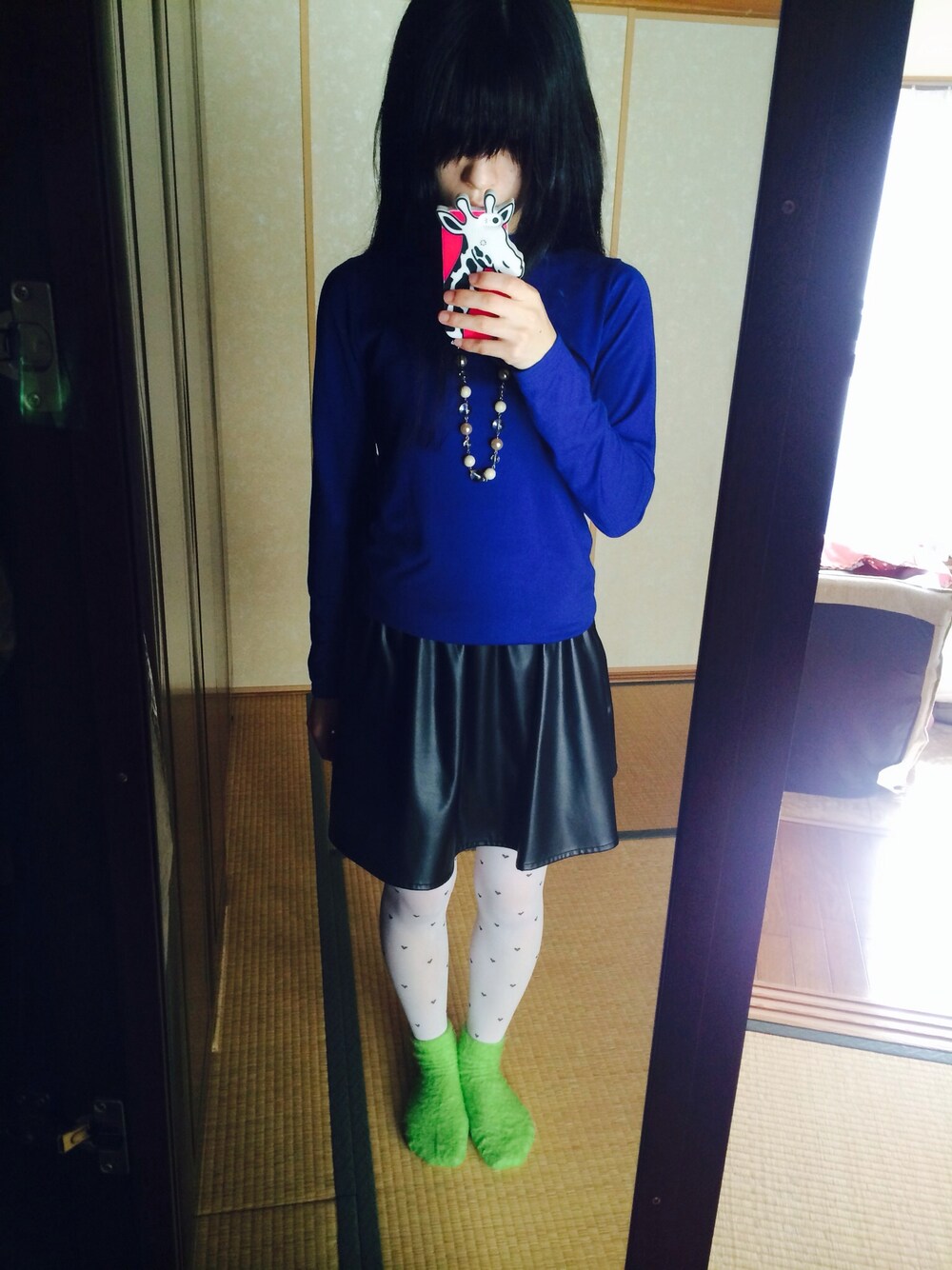 新しくタイツを買ったのではいてみました(*^◯^*) 見えにくいですが、ハート柄です。 ちょっと派手(?)なiPhoneジャケットは今ハマってるブランドFRAPBOAISのキリンさん!!この子といると楽しくなります♪(((o(*゚▽゚*)o)))♪
