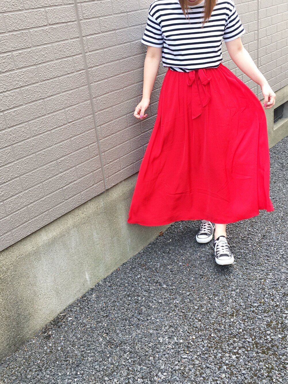 真っ赤のマキシスカート😊❤️ カジュアルにしたくて、ボーダーと コンバース🙆🎀👡