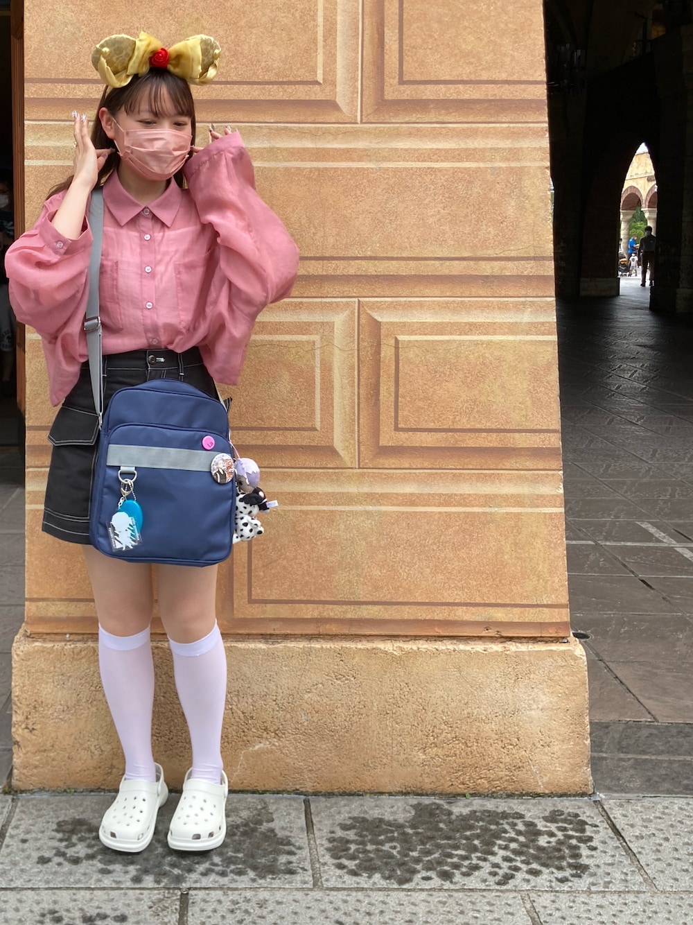 〜ディズニーコーデ〜 このピンクのシアーシャツゆったりしててお気に入り! 白のハイソックスは大好きなアイテムです