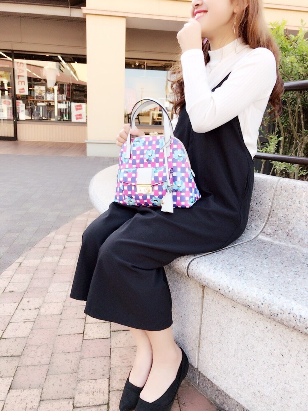 モノトーンコーデにグラフィカルなフラワー柄バッグを合わせたレトロコーデ♡