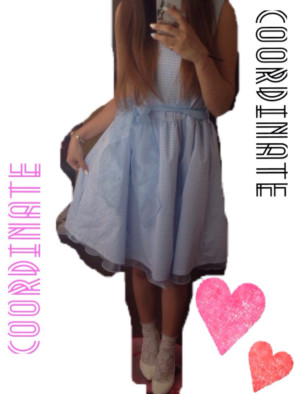 お気に入りのADREEのギンガムチェックのワンピース♡ ブルーで夏っぽくて膝丈がgood!! 自店のホワイトレースソックスに ホワイトのパンプス(*^_^*) ネックレスはシェルだよ〜♪♪