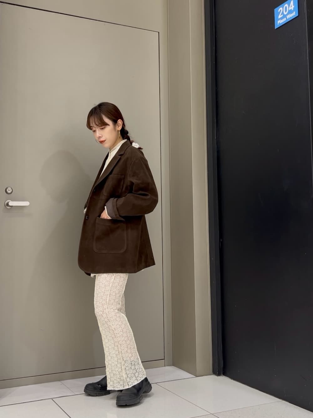 よりヴィンテージ感のあるレースを足して 中物は白で統一。女性らしいスタイリングに。 この秋冬大活躍しそうなジャケットです◎