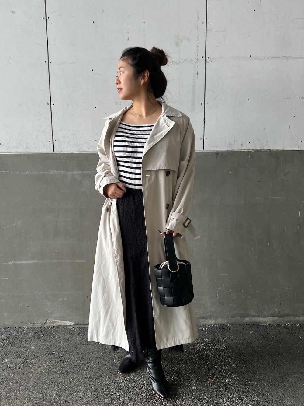 春らしく、ボーダーリブニットとトレンチコートを着てみました🌸 スカートも黒ですが、レースなので重くならず春らしいコーデができます☺️