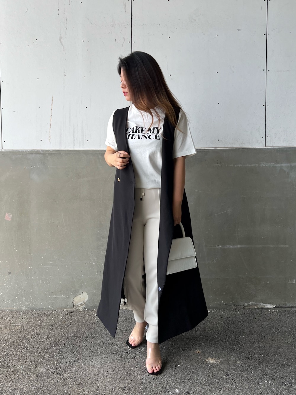 トップス、ボトムスをホワイトでまとめ、黒のロングジレをサッと羽織った大人かっこいいコーデ✨ カジュアルすぎないスウェットが高見えし、大人綺麗にしてくれます! 足元をクリアサンダルにして、抜け感を出しました! 骨格ヴェールでもIラインが綺麗にみえます!!