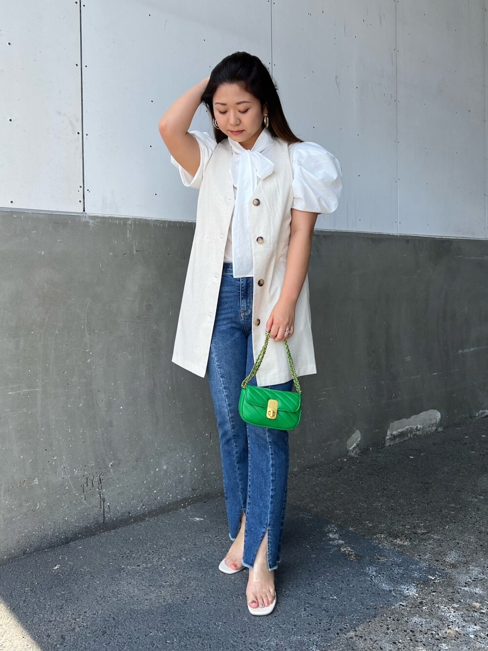 着痩せする!めっちゃ可愛いブラウスコーデ✨ 私自身も凄く気に入ったブラウスです! 前後2wayになっていて、大っきめリボンが可愛いです!袖のフワッと感もフェミニンで可愛くて、ジレとの相性◎ デニムが凄く履きやすいです!!ストレッチが効いてて、楽チンデニムです!! 形が綺麗で神戸店では、試着された方ほぼ皆さん満足されています!人気のデニムです✨ この羽織ってるジレが細く見せてくれるポイントです!少し細身のジレなので、体型カバーしつつ、ラインが綺麗に見えるので着痩せアイテムになってます^ ^ ワンポイントにカラーを入れるとトレンド感のあるお洒落なコーデになります^ ^