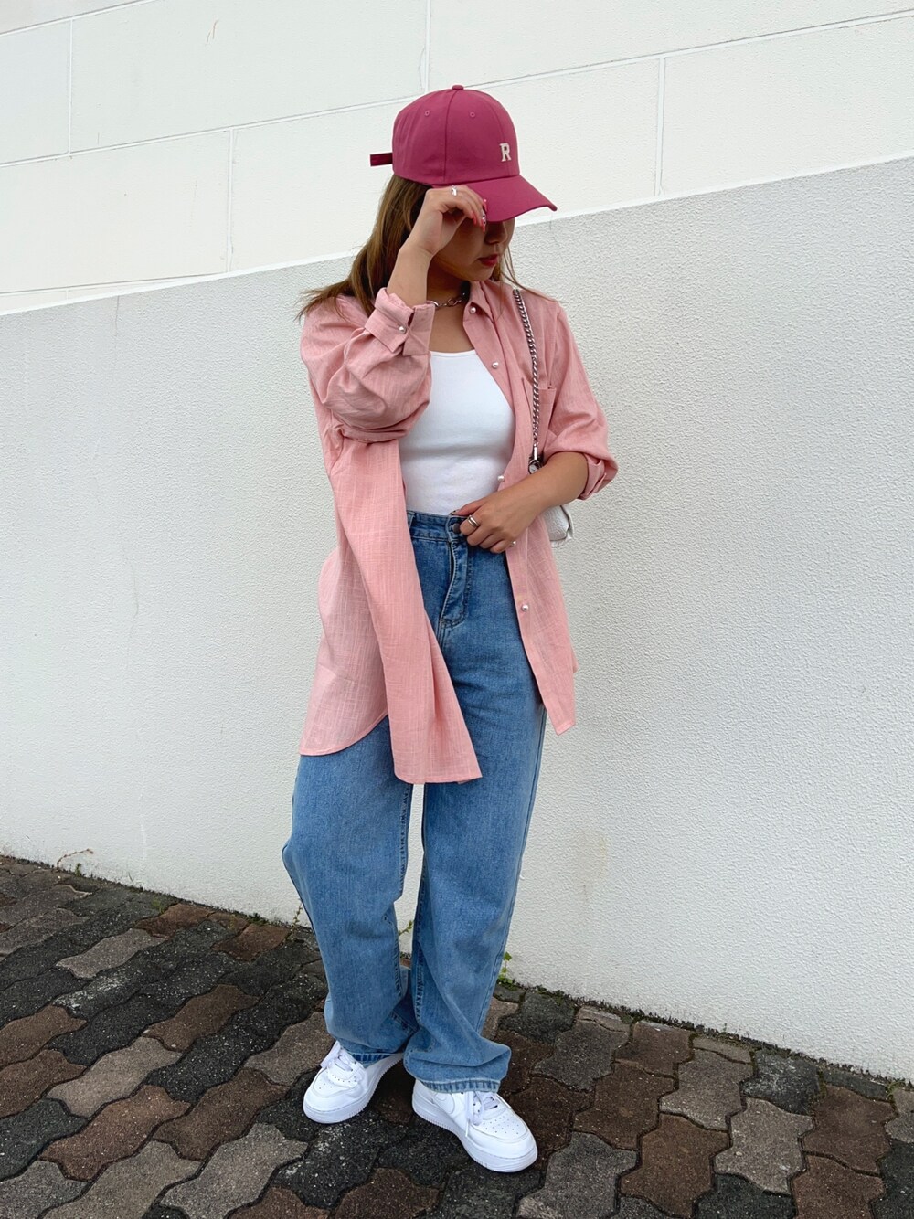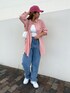 ストリート系コーデをしてみました👖❤️ ピンクシャツとデニムのコラボが可愛い💕 ピンクシャツは綺麗めでもカジュアルでも着回しできるのでおすすめです!