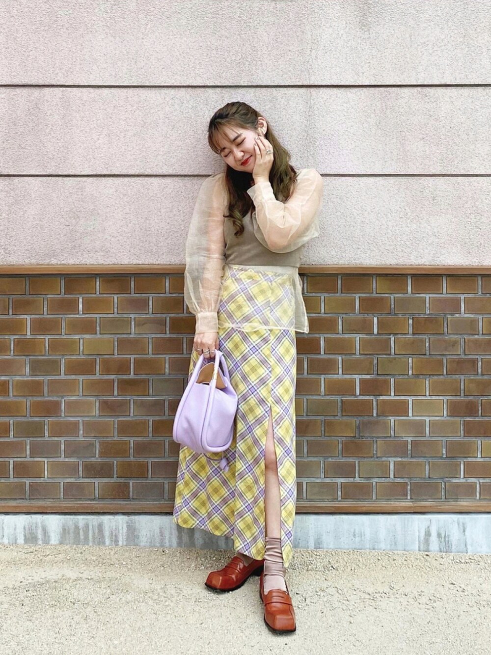 シアーにビスチェって可愛い🦢 レトロガーリー意識!🧳 ビスチェはワンピースからスカートを取り外したもので こういうカラーアイテムとも合わせたかったから 6色展開あるうちのグレージュ選んでた!🐕🦌