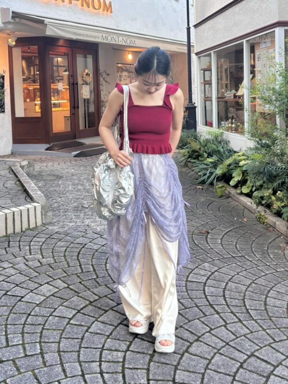 長さを自由な位置で調節できるレーススカートはレイヤードコーデにぴったり🌟