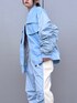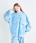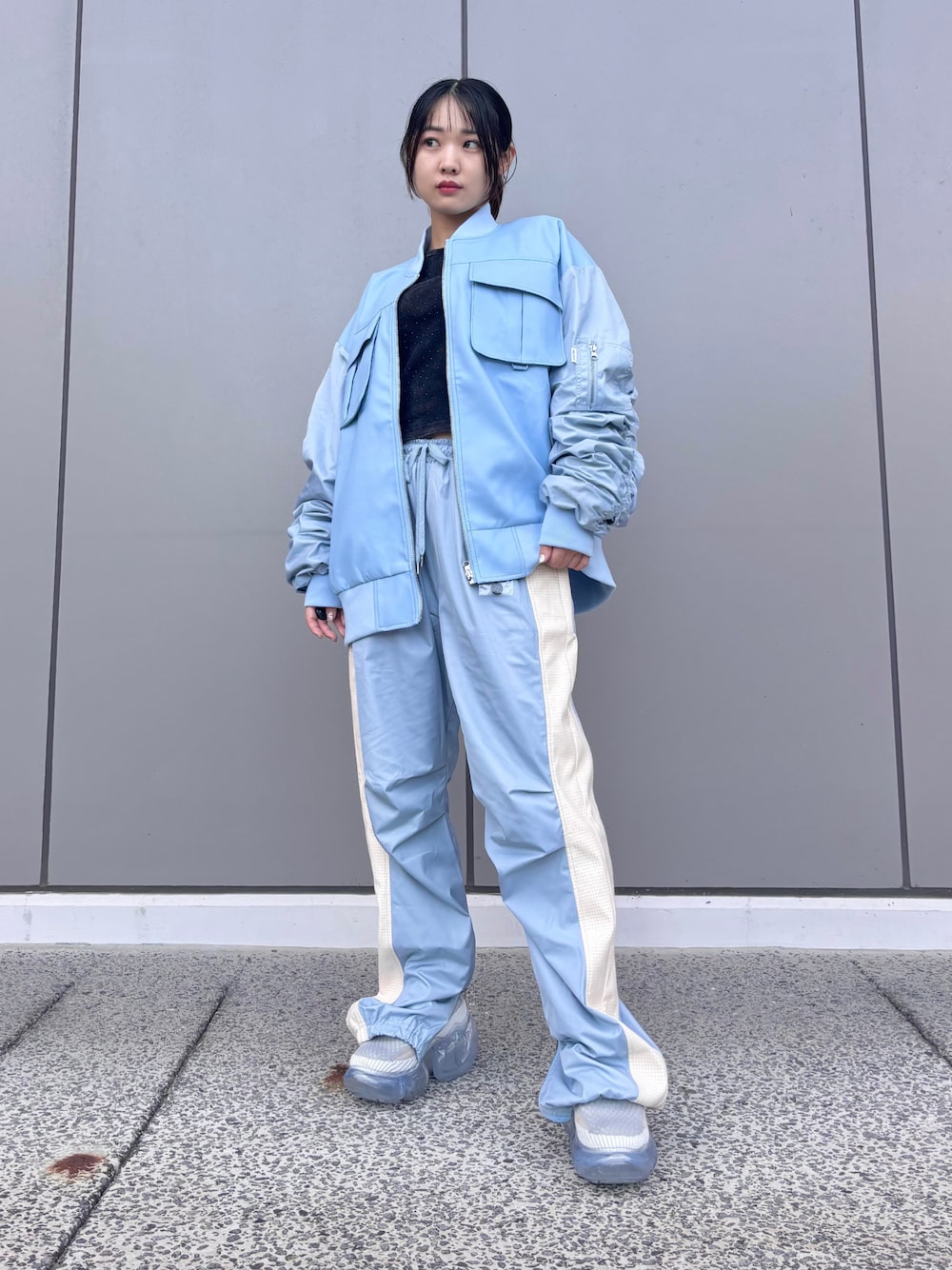 フェイクレザーのセットアップは、サックスがお気に入り🩵お袖のシャーリングがボリューミー、だけど、なぜかスッキリして見えるシルエットです👤