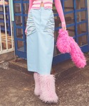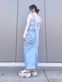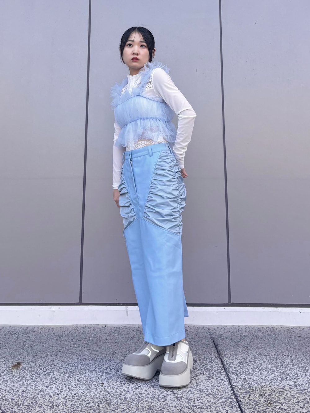短めのシアートップスには、シワのできないボディスーツがピッタリ✨サイドにシャーリングがたっぷりついたフェイクレザーロングスカートは、ボリューミーなシャーリングがついているのにスッキリ細見えシルエットです◎