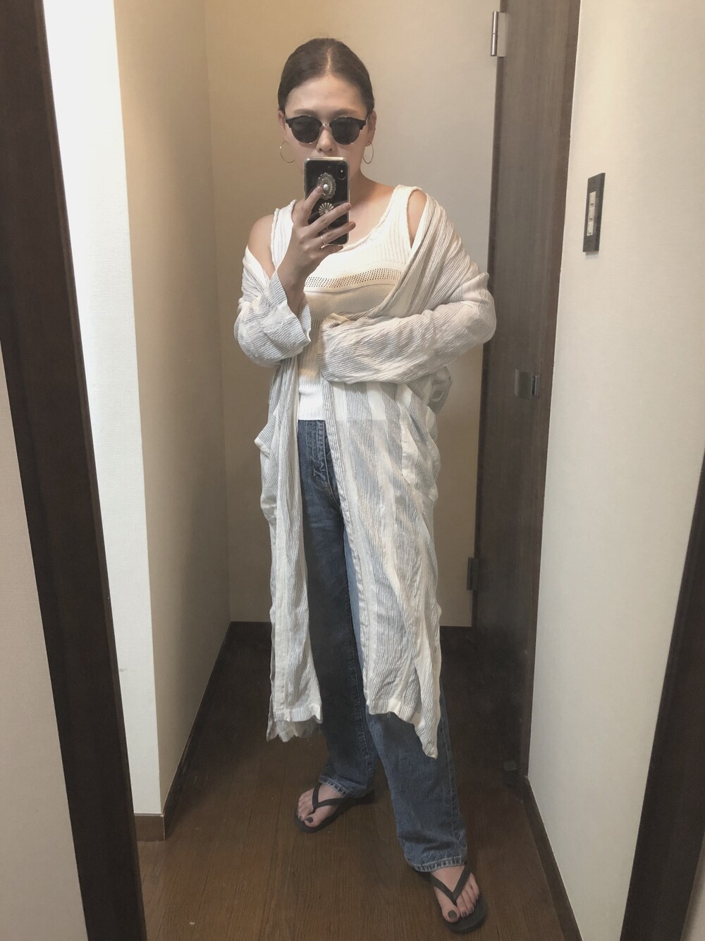 relax コーデ ハワイアナスは痛くならなくで大好き! 外は日焼け対策も兼ねてガウンを羽織って出かけます☀️