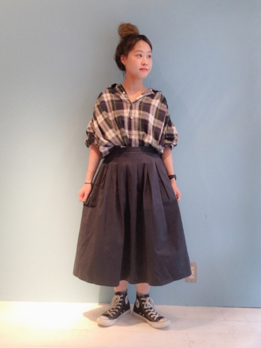 ビッグシャツを抜襟にし、 スカートと合わせました。 メンズライクアイテムを 使うときは必ず、女性アイテムを。