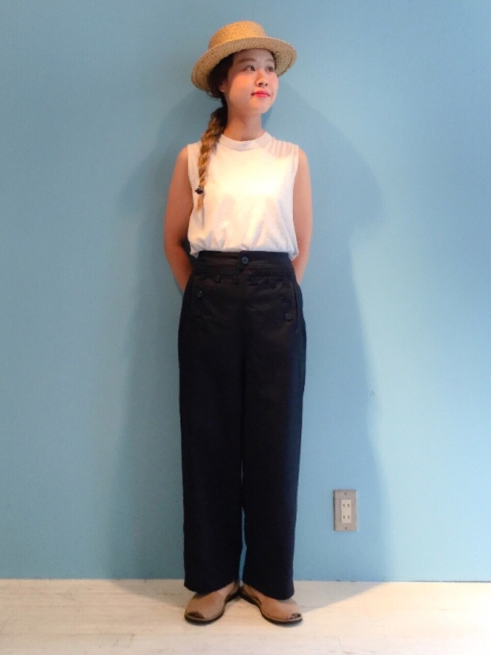 セーラーパンツ、カンカン帽と夏スタイル。 シューズとハットはベージュ合わせにし、 ベーシックなカラーでまとめました。
