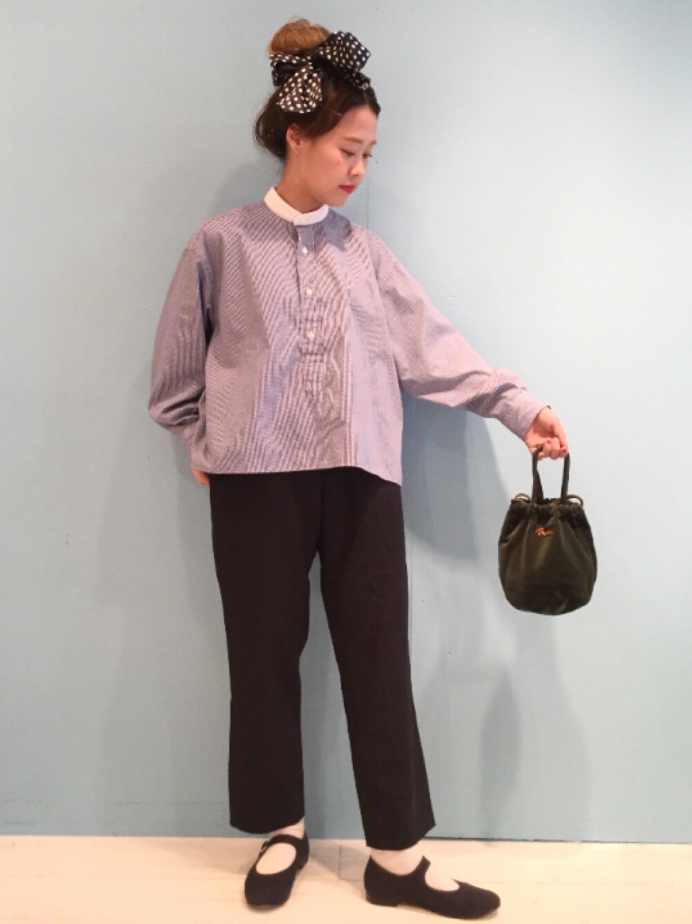 <INDIVIDUALIZED SHIRTS>に オーダーしたプルオーバーシャツ。 細かなギンガムチェックで爽やかな印象に、 たっぷりとした生地感で女性らしく、 襟はバンドカラーにしてカッチリ感を出しました。 細身のスラックスとの相性が◎。 抜け感のないスタイリングに仕上げました。