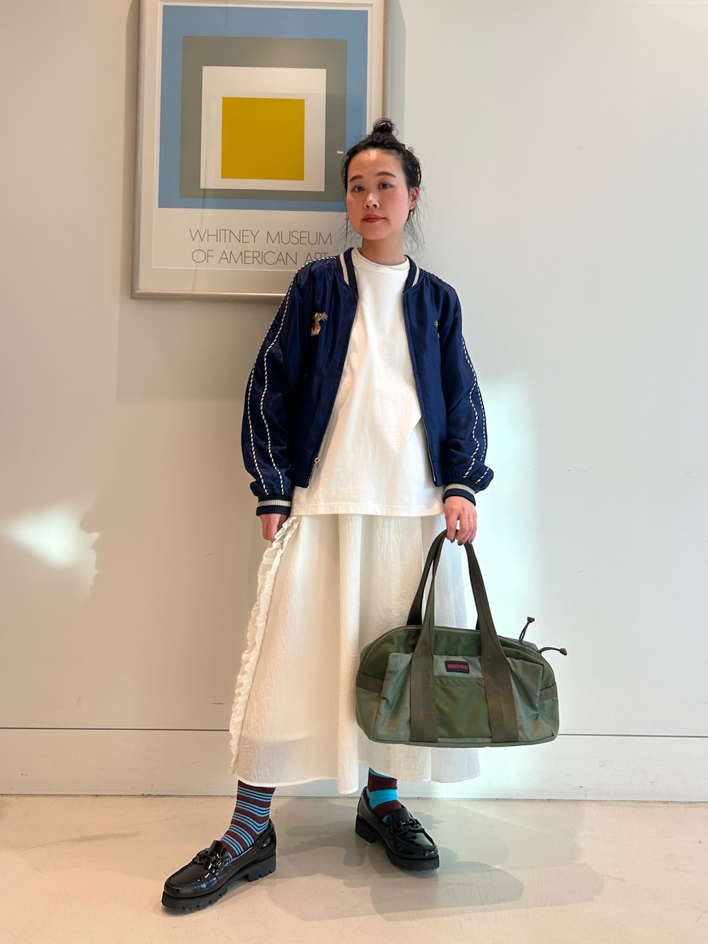 【ハードなアイテムはフリルと合わせる】<テーラー東洋>×<BEAMS BOY>のスカジャンとTシャツ。50周年を記念したアイテムとなっております。刺繍のインパクトが強めのアイテムなので、パンツではなくスカートを選びました。このバランスが、私がコーディネートする上で気をつけているところです。また、スニーカーではなくローファーでかっちりと。気になられた方は、お気に入りにご登録ください!