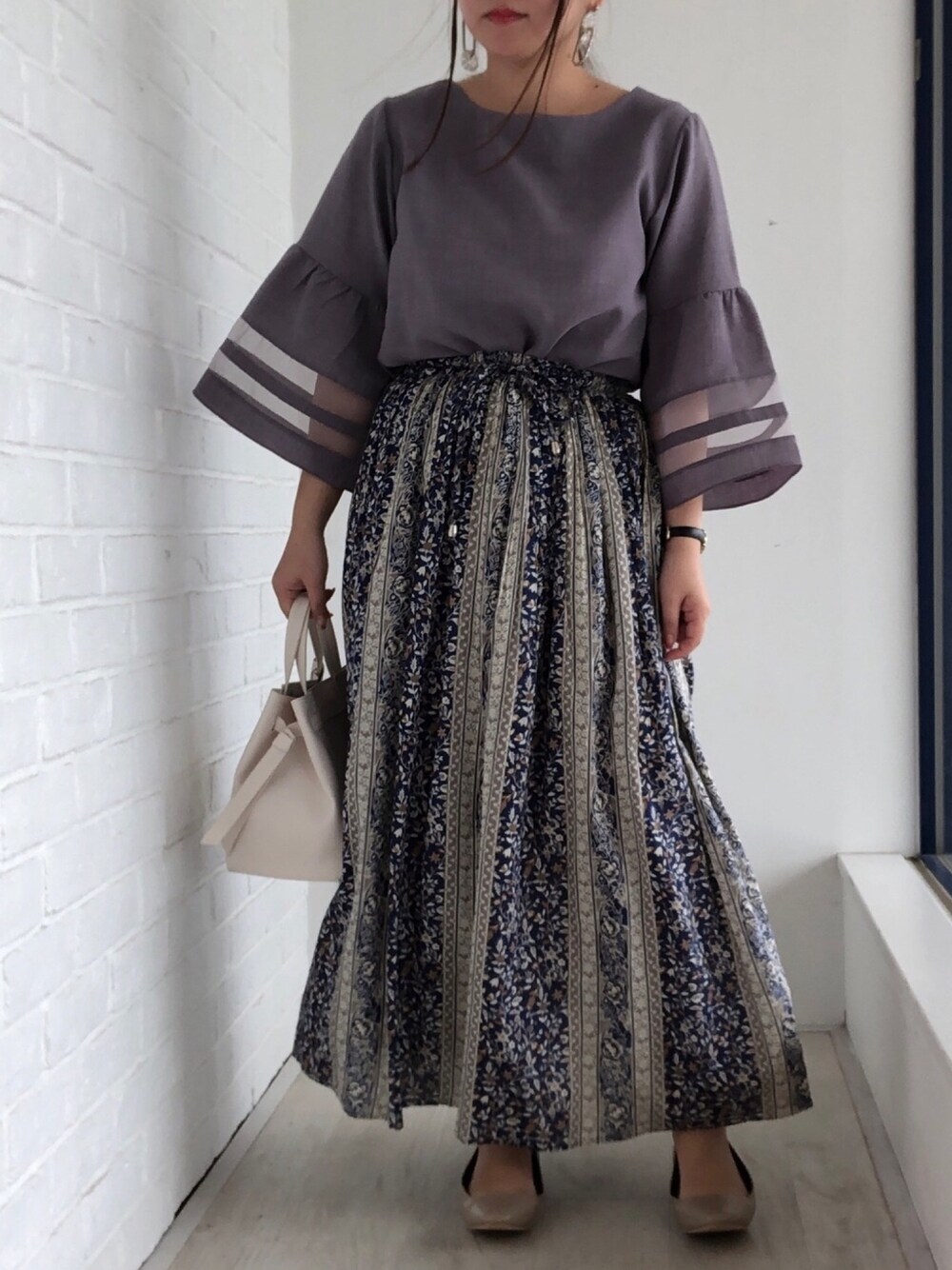 デザインが可愛いスカートとブラウスのコーディネート♡ 落ち着いたグレーにオシャレなパネル柄のスカートで大人っぽく上品に♡ こちらのアイテムはURLでご紹介してます♡