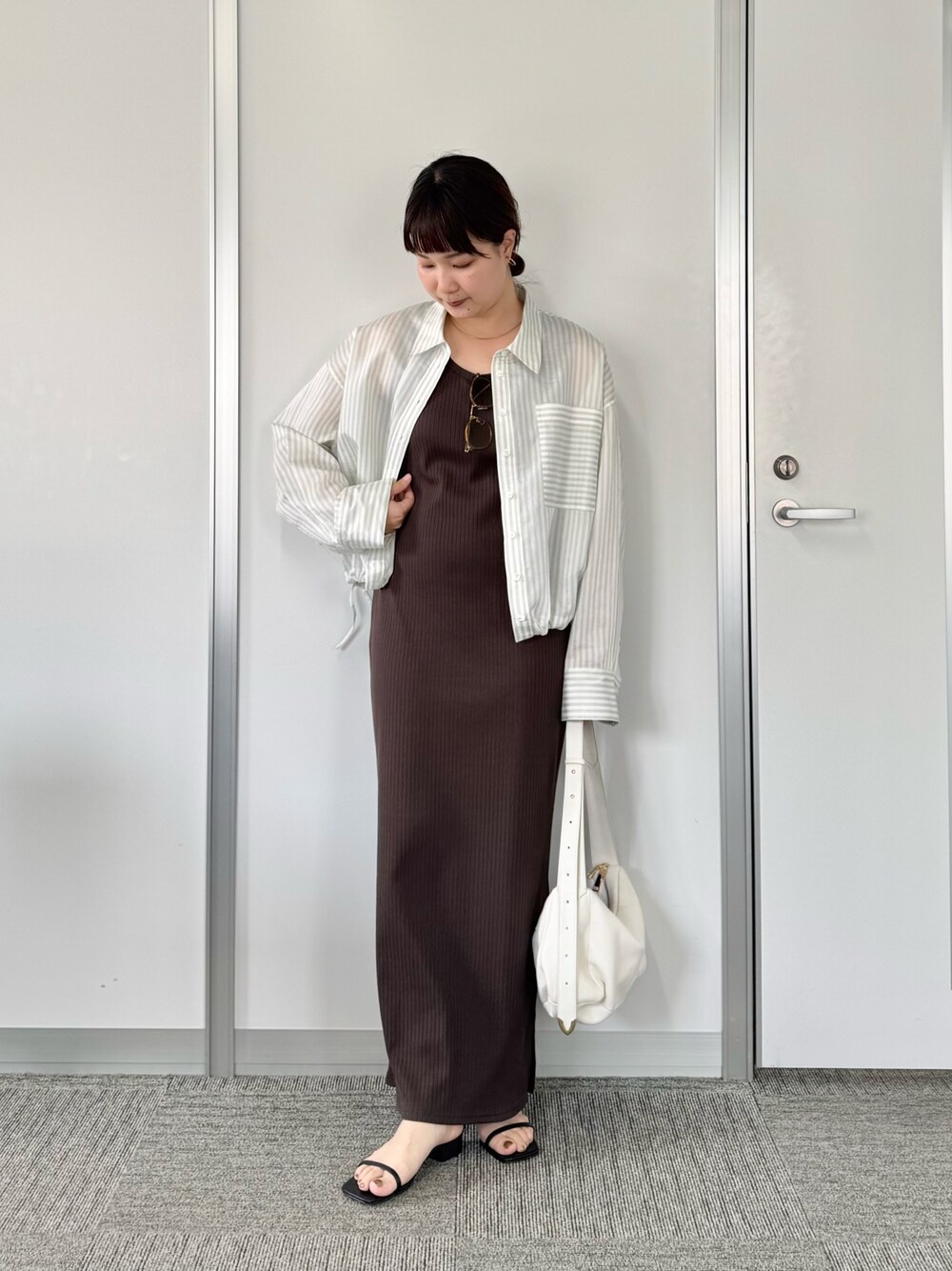 ミントグリーン×ブラウンの色合わせがオススメのスタイリングです。 ワンピースはFサイズを着用しています。