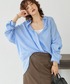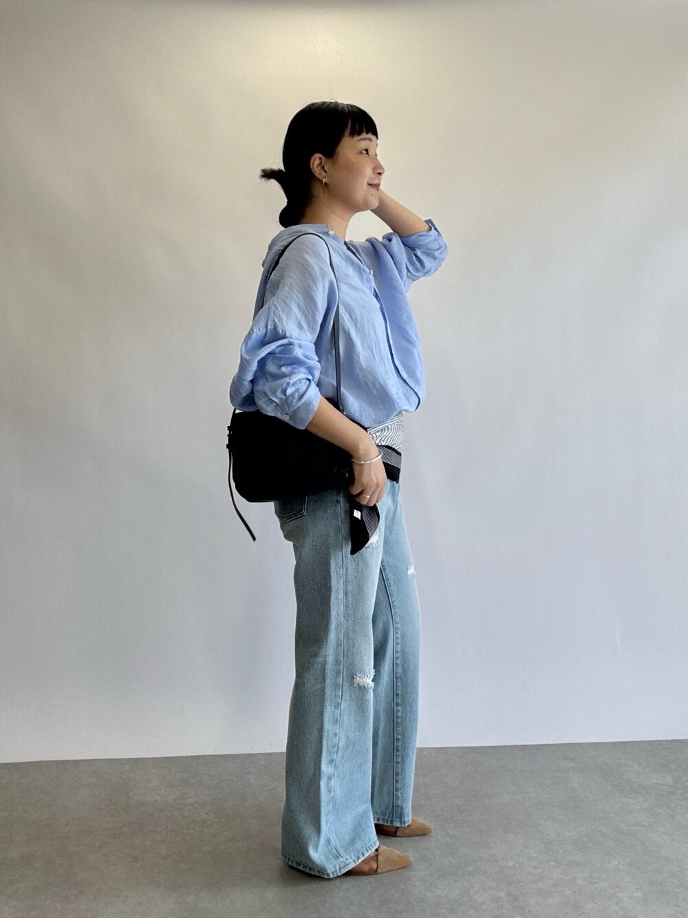 サックスブルーのワントーンコーデ。 スカーフを巻くことでメリハリがつくのでおすすめ!