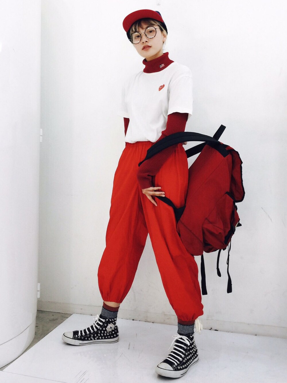赤コーデ 派手になるけど、まとまり意識。 ストリート感強めですね。