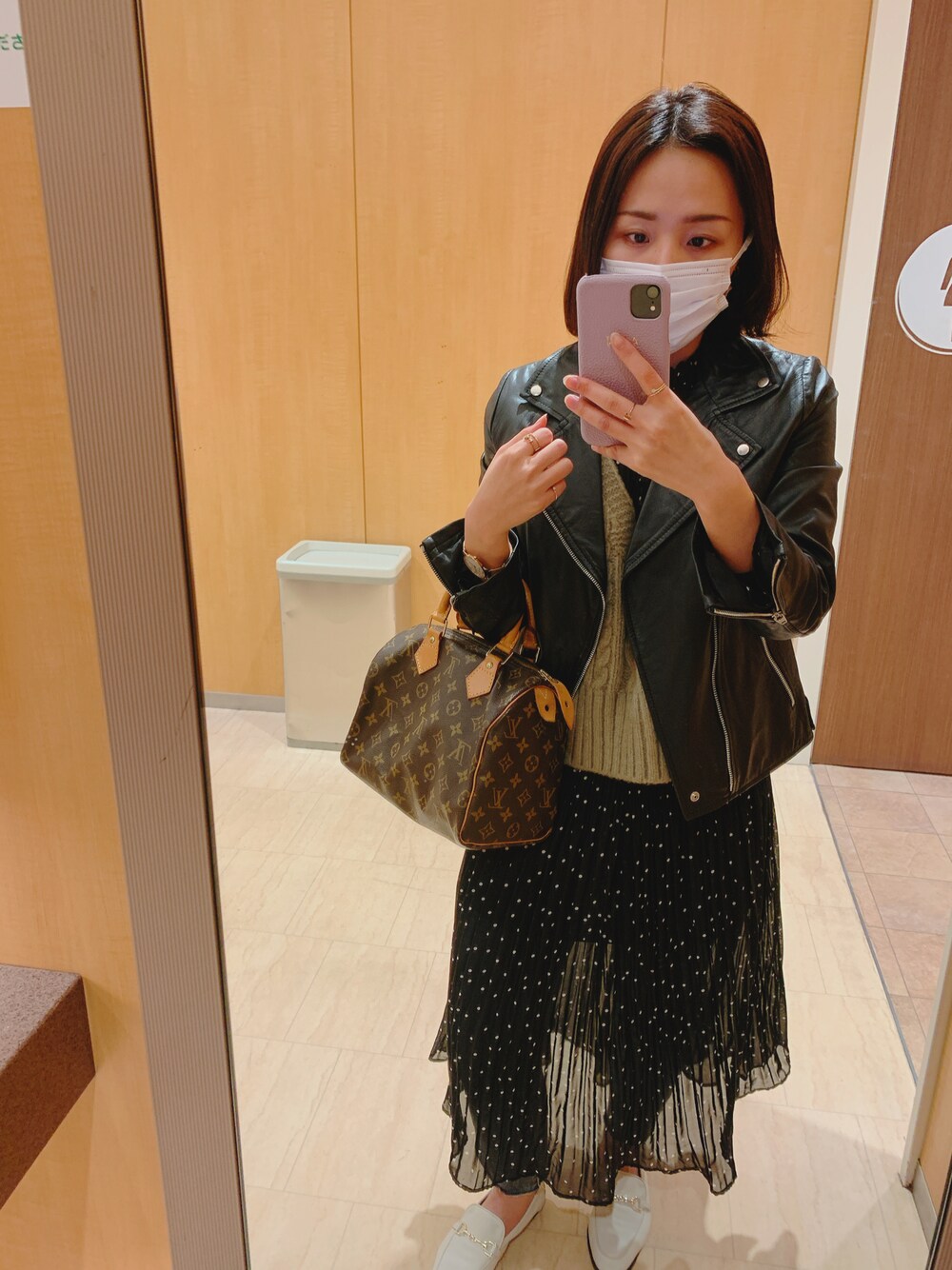 韓国風レイヤードコーデ🇰🇷 辛口ライダースはシフォン素材のドットワンピースと合わせてバランスをとってます! 去年購入したZARAのニットベストはグリーンの色味がかなり可愛い💕