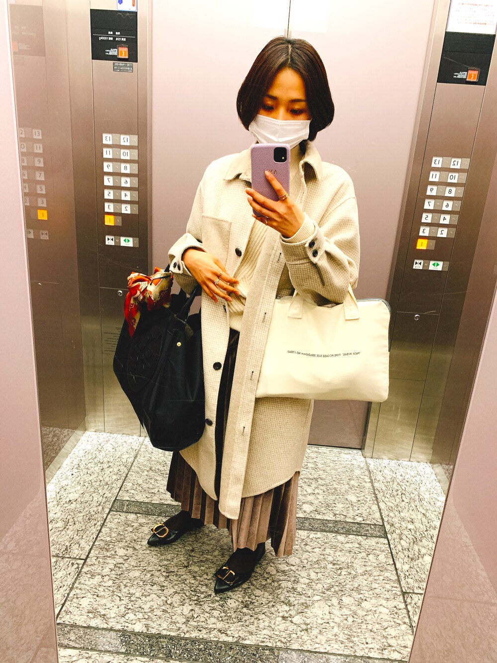 カフェラテのような温かみのある色味を意識した スカートコーデ☕️ ベロア素材特有の光沢感が上品👍 色味もブラウンなので、イエベ秋さんは大得意なカラーです🙆♀️ オリエンタルトラフィックのリボンモチーフパンプスのデザインがおしゃれで、秋冬コーデを一気に高見えさせてくれます💕 ツルツルした光沢ある素材にリボンが施され、高級感ありのお値段以上です👏 冬はスカートスタイルだと、どうしても足元が重くなりがちですが、パンプスのゴールド金具により華やかな印象をプラスしてくれます! 色違いのベージュも購入検討中です笑 エレベーターの中ですみません😂😂