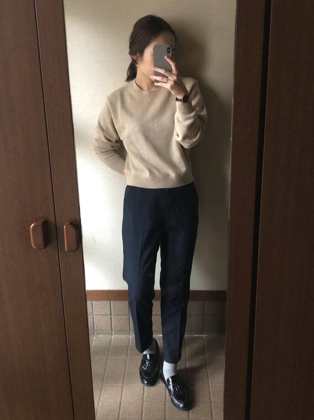 UNIQLOのニットはグリーンと2色買いしたもの。 さっと着れてシンプルな服装に合います。 足を少し変えてローファーを履きました。 細身なシルエットでタッセルも付いていて、女性らしい形でかわいいです。