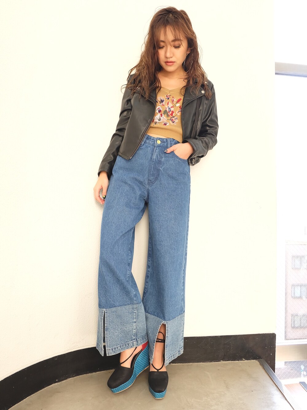 佐々木彩乃のライダースジャケット「フェイクレザーライダースジャケット」を使ったコーディネート