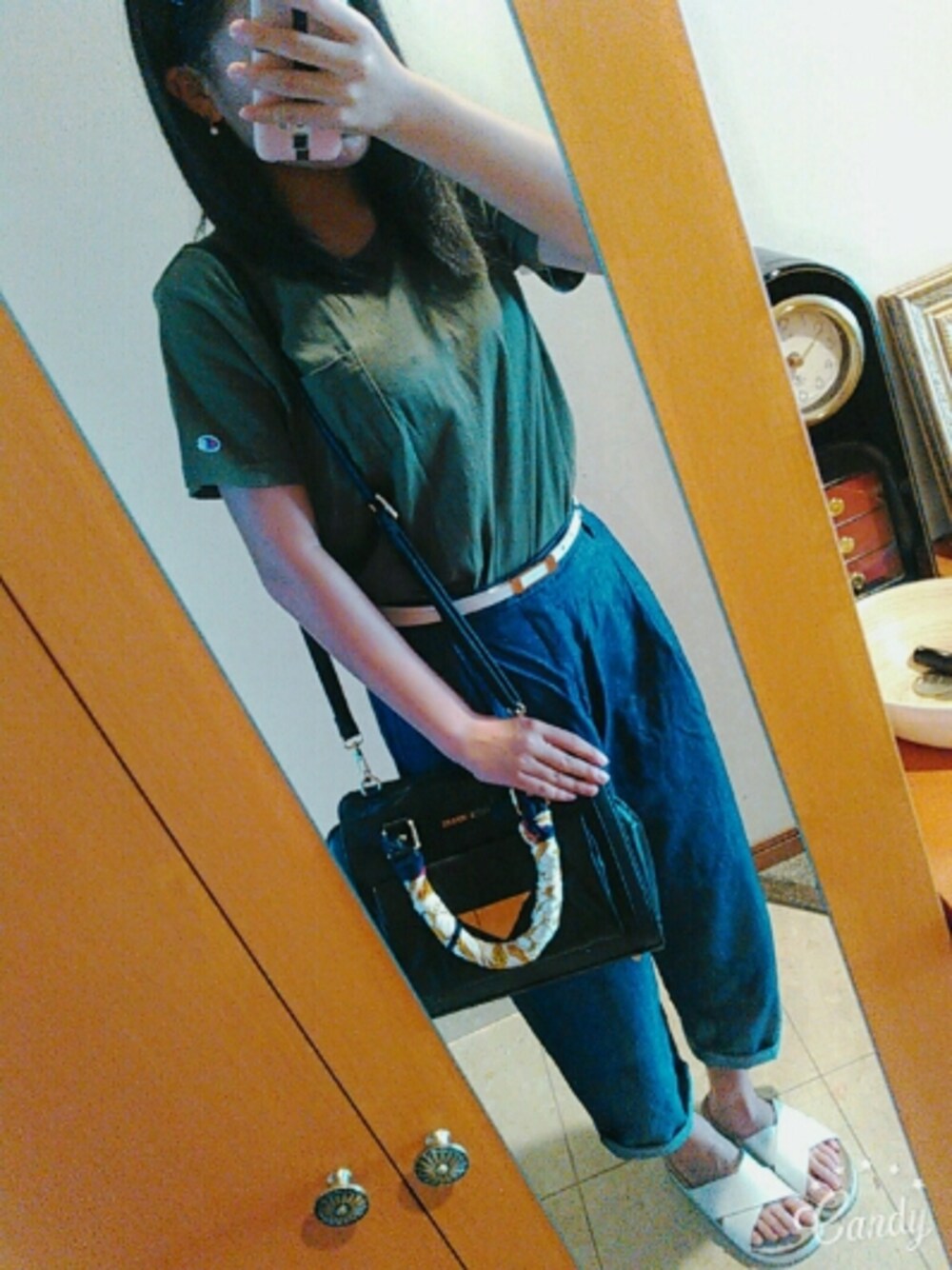 グリーン系のTシャツ/カットソー、ブラック系のその他パンツ、ホワイト系のサンダルを着用したレディースの秋コーディネートの1枚目の写真