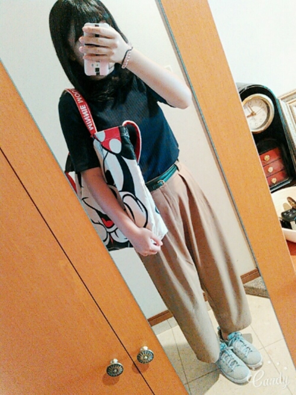 ベージュ系のその他パンツ、ブラック系のニット/セーターを着用したレディースの秋コーディネートの1枚目の写真