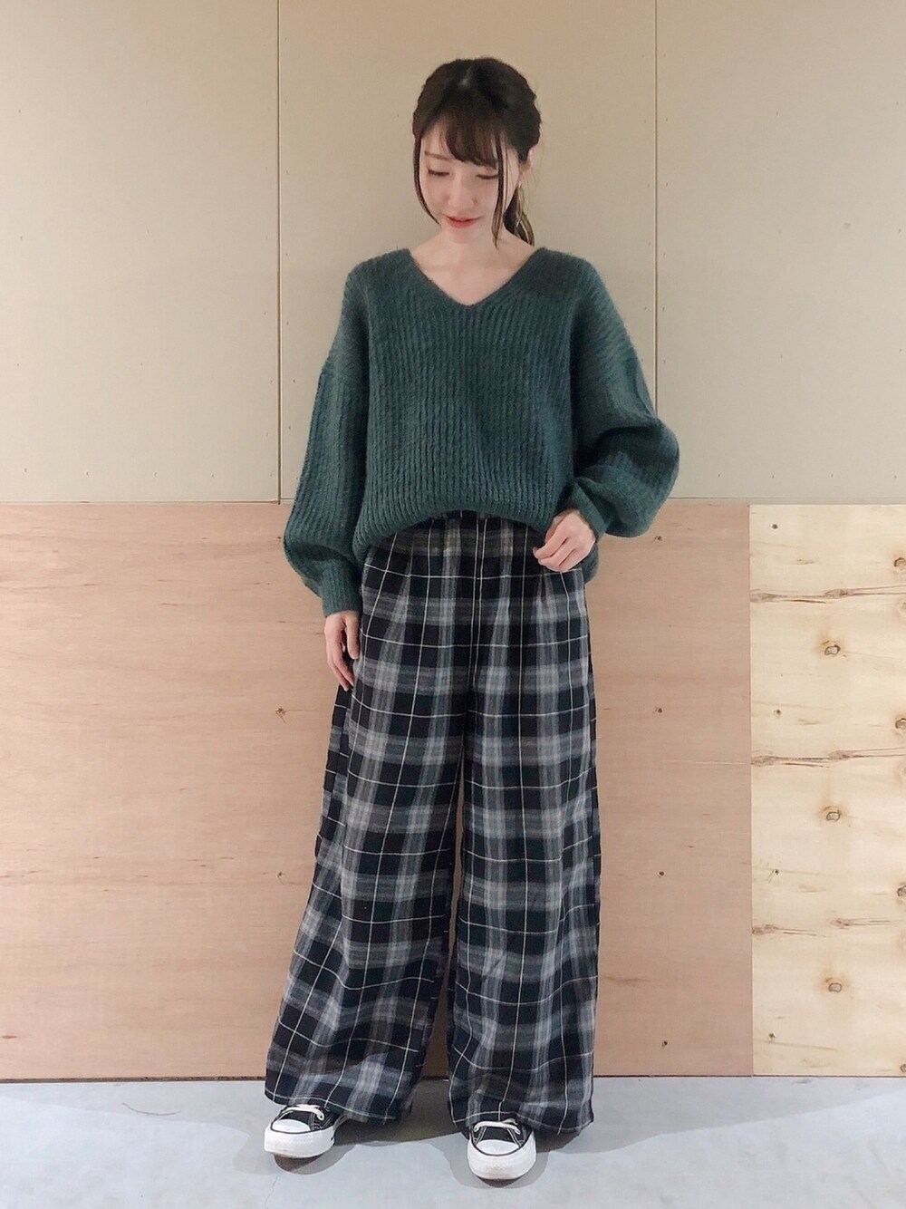 ふわふわなシフォンケーキニット♡ ハイネックとVネックの2種類ありますが、ボトムスもボリュームがあるのでVネックを合わせました。 パンツは内側に紐が付いてるのでウエストの調整可能◎
