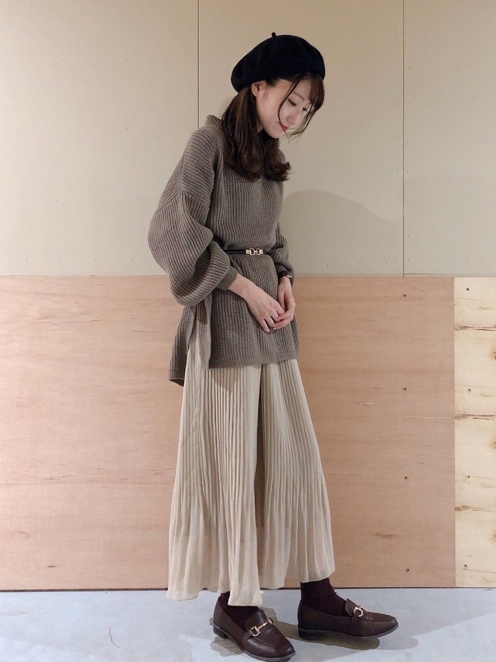 ブラウンコーデ♡ トップスはサイドのスリットがすっきり見せてくれます。 カラバリ豊富です💡 スカートは女性らしいシフォン×プリーツ