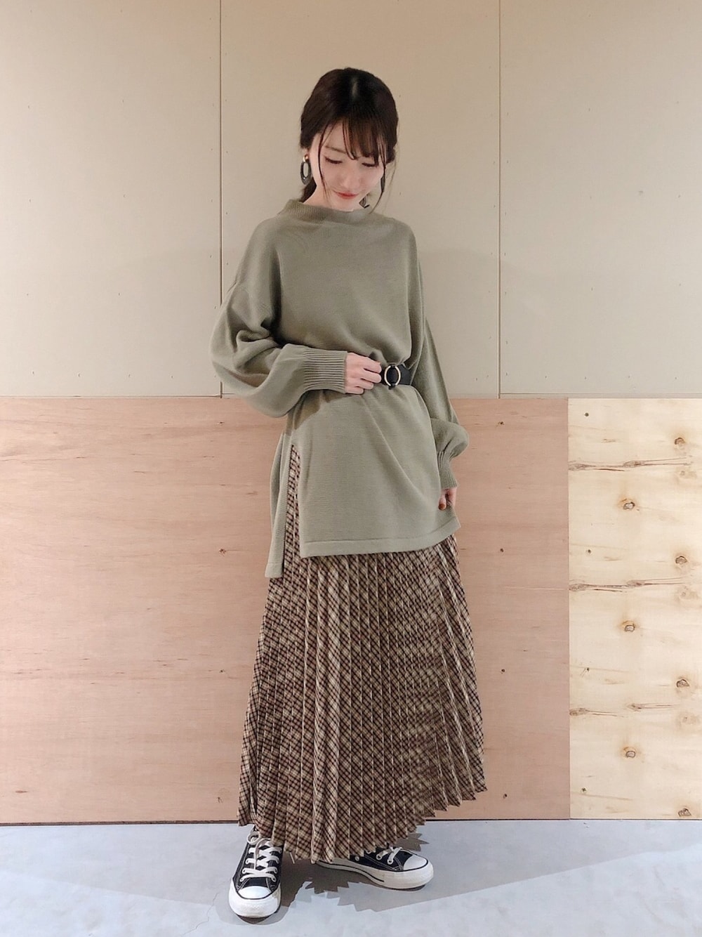 ボードネックにスリットで、すっきりしたデザインのチュニック。 プリーツスカートは引きつって人気のアイテム♡