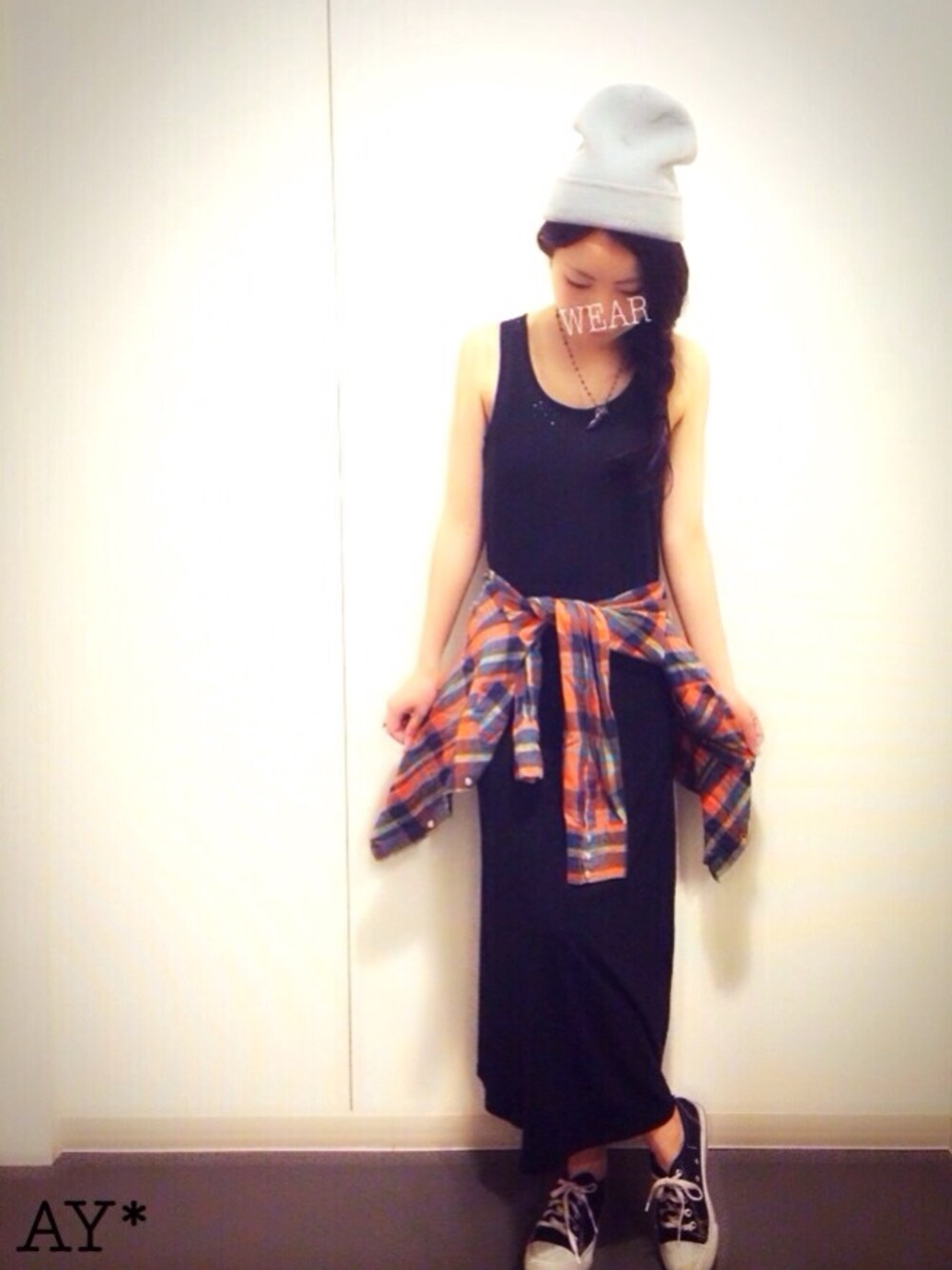 黒のマキシにチェックシャツ。 またまたらくちんコーデ*\(^o^)/* あまりにもゆるゆるなので ちょいとごつめのシルバーアクセ投入。
