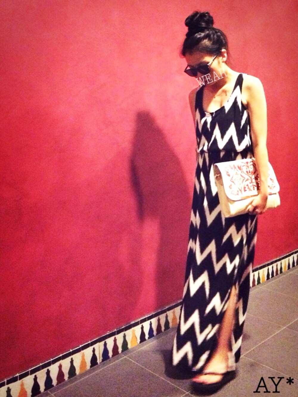 ルーズめのてきとうなおだんごと サングラスの形と足元のビーサンは ピックアップタグの海外セレブ風を 意識したつもりです\(^o^)/ H&Mのマキシワンピは 背中があいてて、足の両サイドにも 深めのスリットが入っとります。 パパラッチ風に(笑)歩きながら 撮ってもらったんやけど、 いまいち伝わらへんw残念w