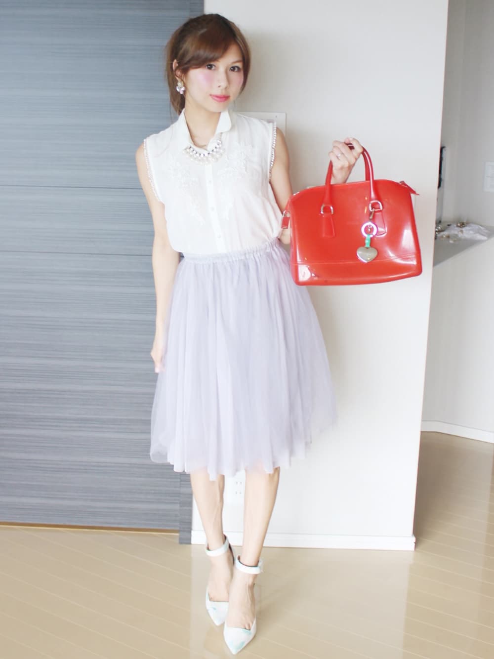 チュールスカートを主役に、ガーリーで可愛いコーデ