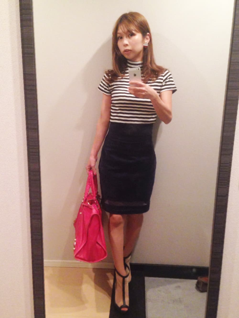 ハイウエイストのタイトスカートにミニ丈のトップスで足長効果❤️ オゾックの透け感のあるブーティを履きました!