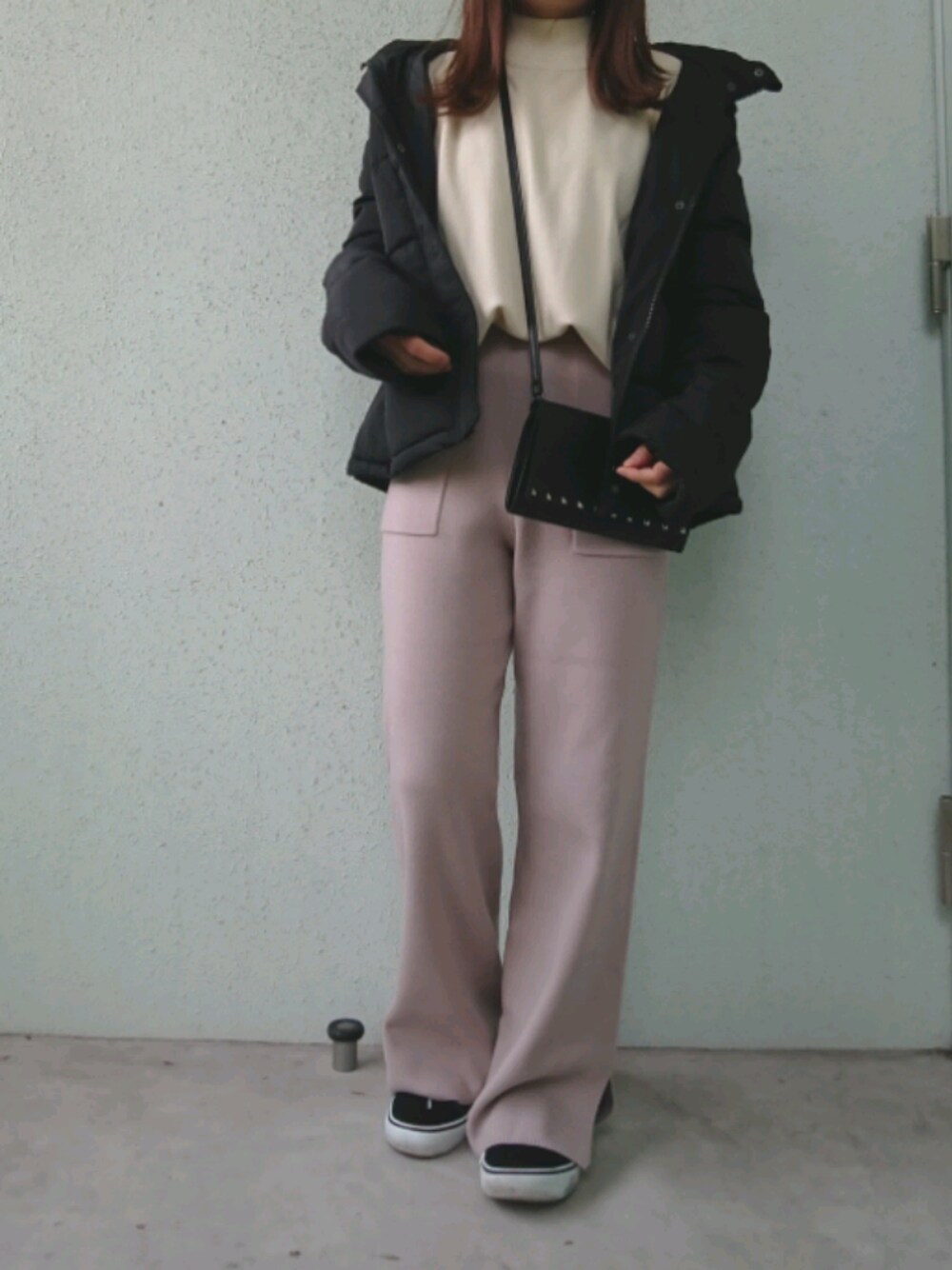 見て下さりありがとうございます✨ Instagram☺aya.wear08 ダウンジャケット着回し③ ワイドストレートニットパンツと 合わせてカジュアルすぎないように🦸♂️ このパンツ、 脚が長く見えるような気がする! めちゃ形が綺麗🥺 アウターとニットを 着回しました☺️