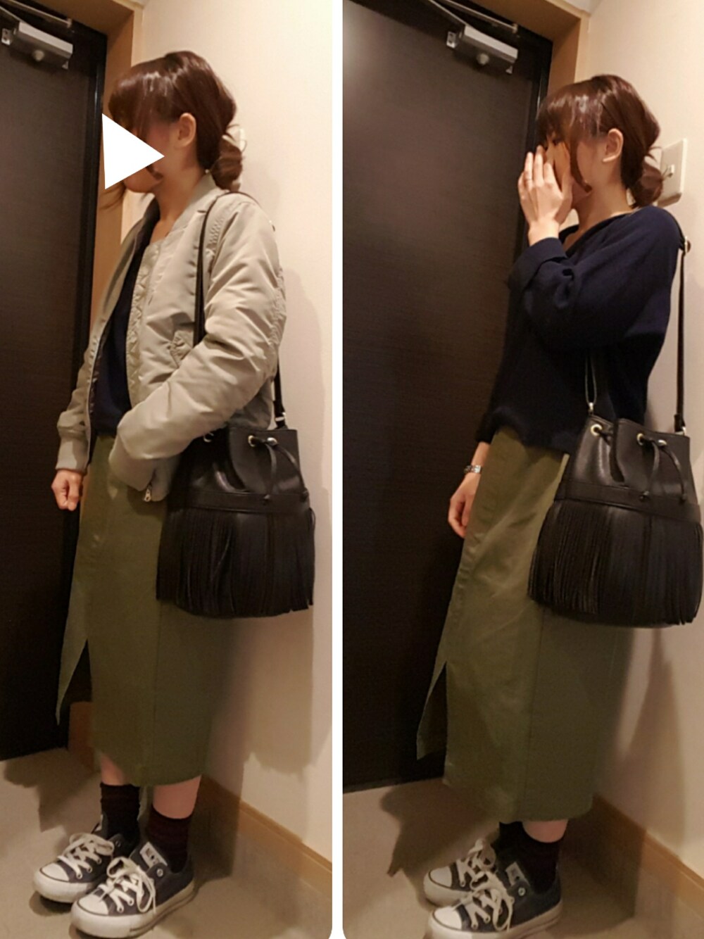 こんにちは🌼 ご覧頂きありがとうございます🍀 はなほじってません☺←byゆみたす 猫背すぎて反省😭😭😭 見えてないけど、靴下はネイビーにボルドーのラインソックスです💞 薄いから多分ダイソーです♥笑 ヒートテックの季節になるとVネックニットのインナー悩みます。。 welinaちんみたいにレースのちらみ可愛いなぁ~🙋💓 ユニクロのMA-1、いつも行くビルの守衛さんにも人気でした☺ 明日ユニクロ行こ~って言ってて笑っちゃいました😋💕
