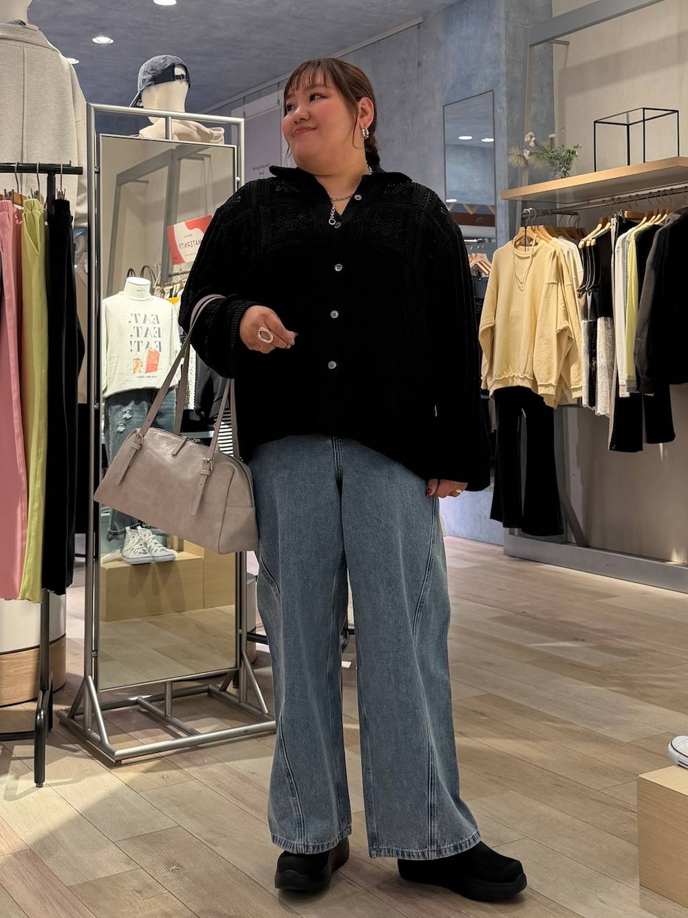 Instagramもしています❤️ フォロー・Instagramからご購入していただけると 励みになります🦋 からご覧頂けます📸 *トップス* ゆったりとしたサイズ感。 クロシェのシャツは透け感もあり、デザインが引き立つ1枚♡ 私はボタンを少し開けて着るスタイルが◎ インナーを色物にして透け感を楽しむのもオススメ。 *インナー* ちょうど良いサイズ感。 ピッタリし過ぎず、後ろにスリットがあります。 生地は柔らかく伸縮性があり、 袖のシアーがワンポイントになりますよ♡ *ボトムス*(Lサイズ着用) ウエストとヒップはピッタリ。 お腹周りは伸縮性ないので、ほぼゆとりなしのサイズ感です(笑) 脚周りはゆったりとしています。 形は凄く綺麗で広がりのないストレート。 唯一、お腹周りはパツパツです。。