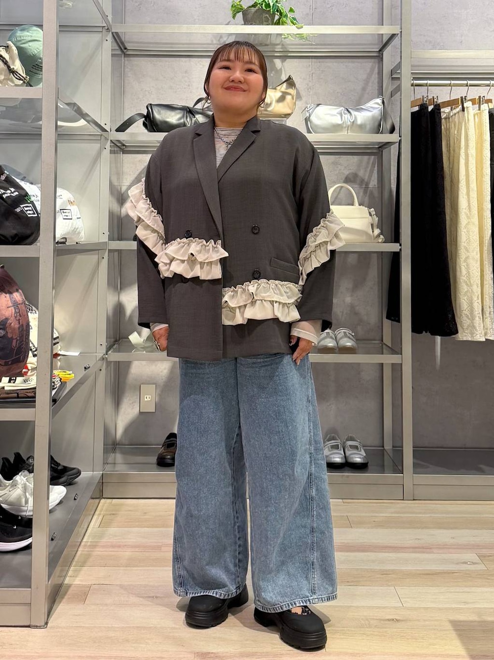 Instagramもしています❤️ フォロー・Instagramからご購入していただけると 励みになります🦋 からご覧頂けます📸 *ジャケット来 ゆったりとしたサイズ感。 リネンライクシリーズなので軽くてサラッとしてます。 シワにもなりにくいのもポイント! フリルがアクセントになり可愛いです。 *インナー* ちょうど良いサイズ感。 ピッタリし過ぎず、後ろにスリットがあります。 生地は柔らかく伸縮性があり、 袖のシアーがワンポイントになりますよ♡ *ボトムス* ゆったりとしたサイズ感。 ウエストは総ゴムで楽ちん! かなり太めのワイドパンツです。 柔らかく軽いデニムでゴワつきが苦手な方に。 伸縮性があるので動くのも楽々ですよ◎