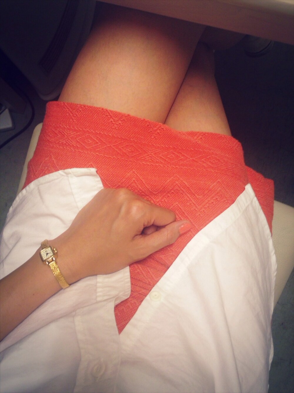 お気に入りのMarinJQスカート♡ シャツと合わせるcodeが いちばんスキ♡ 夏はオレンジ×ホワイト×ネイビー×デニムでほぼ着回し♡ 時計はいつものRosemont★ 華奢で女性らしいアクセがスキ♡