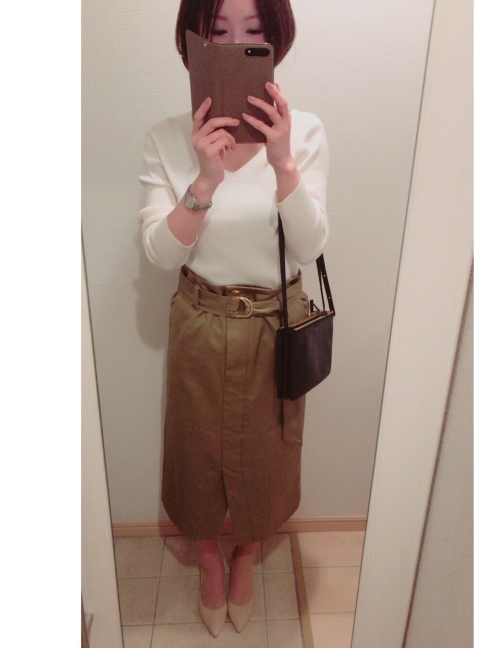 ガリャルダガランテのスカートは ほどよくくすんだカーキとゴールドのバックルがイエベ秋の自分にはドンピシャでした🙀♡. ハイウエストでシンメトリーなデザインは流行だそうですね🙂ハリのある素材で年中つかえそうです✨