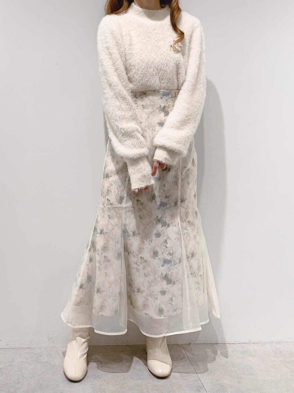 aya_shapo(one after another NICE CLAUP)のニット/セーター「トレンドのブローチセット。ふわふわフェザーニット」を使ったコーディネート