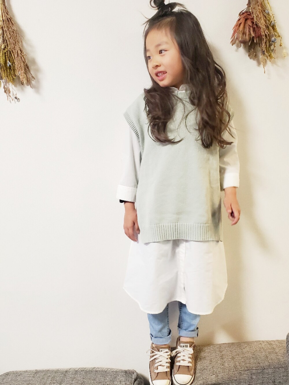skhanaのワンピース「【キッズ】ベストSETシャツワンピ7分袖/878706」を使ったコーディネート