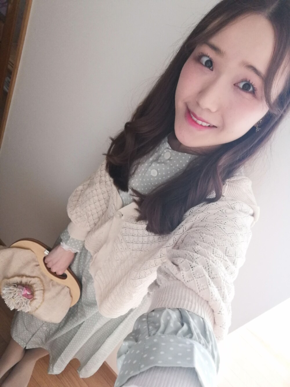 ミントのドットワンピースに、ナチュラルなフード付きカーデで春色コーデにしました◎ 古着屋さんで購入したハンドバッグがとても可愛い〜*女性の横顔のブローチが前についてます。