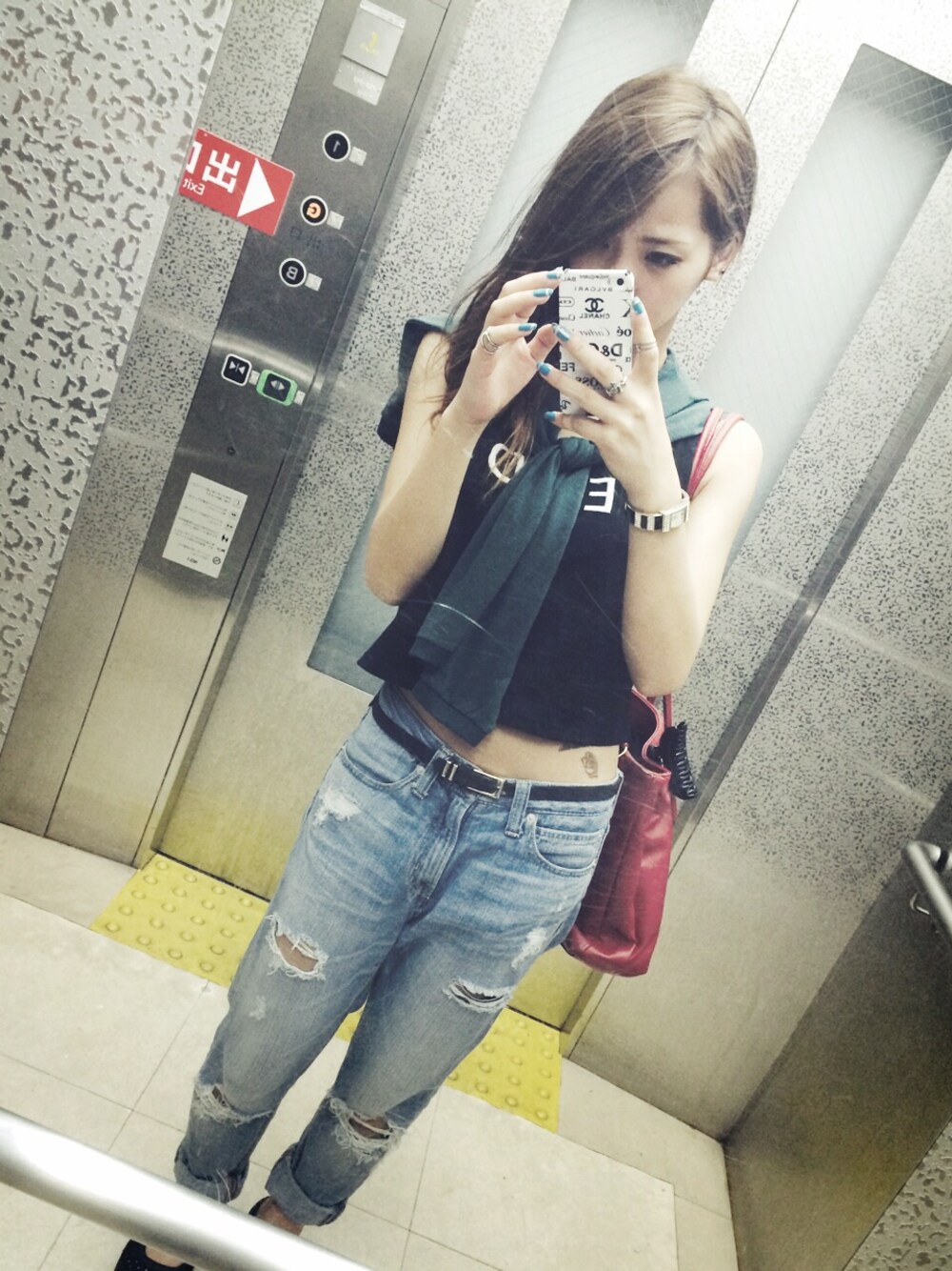 ブルー系のデニムパンツを着用したレディースの夏コーディネートの1枚目の写真