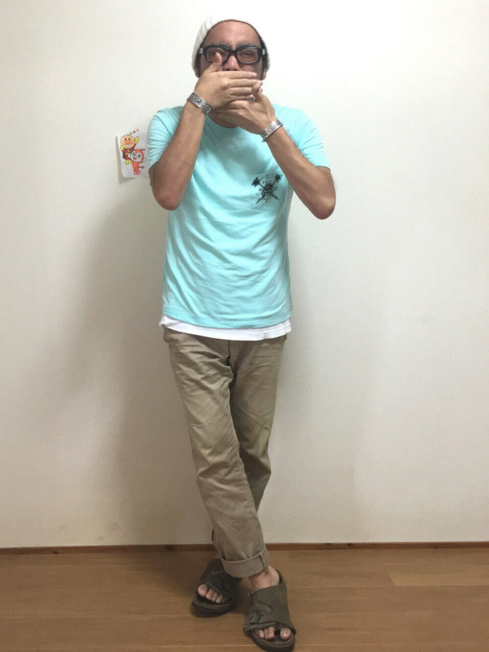はいさい❗️ いつもイイね・SAVEにコメントまで有り難うございます💋 先週末、飲み会前に眉毛→→鼻毛→→仕上げに髭ちゃんを整えていたらバリカンでゴッソリやっちまいました… バリカンのアタッチメントを2.5cmに変えていたまでは良かったんですが、バリカンを入れる向きを逆にしてしまいジョリ……っと根こそぎ0.1cmくらいに(笑) 命の髭ちゃんは修復不可能となりそのまま全剃り。 まるで子供のように心はギャン泣きして、その夜は朝まで酒とカラオケを楽しみました🍻 髭ちゃんが生えそろうまでコーデもシックリきそうにありませんね💨 さて。 暑くなるとどーしてもTシャツだけのシンプルで単調なコーデになってしまいますね💦 あまり披露出来てませんがアロハの時も多くなります。 今までのコーデからは想像もつかないとは思いますが、今回の主役はVOLCOMのポケT。 去年まで一度もチェックしたことのないブランドだったんですけど、スケートパンク?スケートロック?のようなテイストの物もあったりして、漁ってみると良いのもあります👍🏼 Tシャツの色に合わせて他アイテムも爽やかに仕上げてみました😀 てか、日焼けし過ぎて爽やかさゼロ(笑)