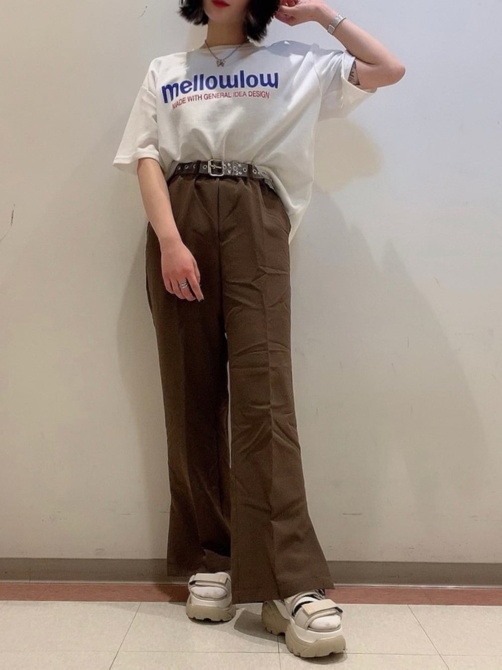 DING/mellowlow Tシャツ/¥3,299(税込) WEGO/クリアハトメベルト/¥1,429(税込) WEGO/カラースリットフレアパンツ/¥2,199(税込) WEGO/ボリュームソールスポーツサンダル/¥4,399(税込) ※↑記載価格は定価の為、価格変動ございます。 InstaプロフィールのURLから着用商品購入可能です☺︎ 【Instagram】__ogew154cm.__